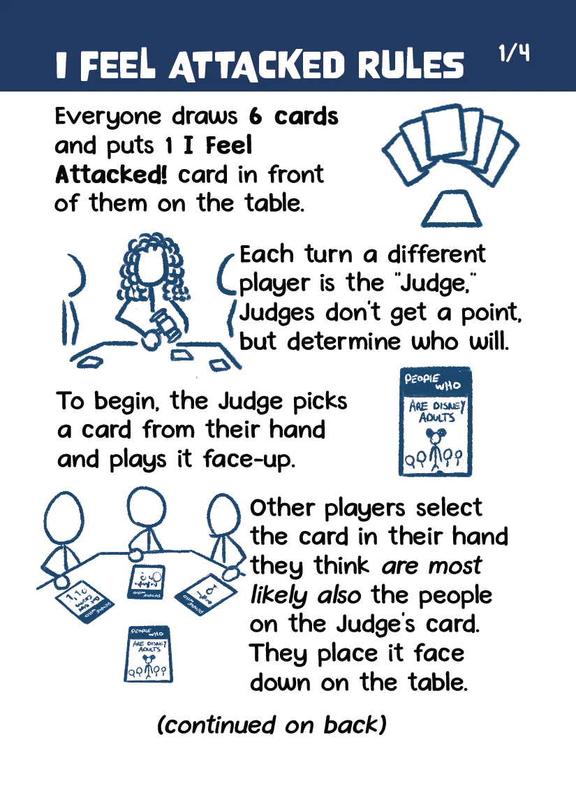 Though the first "base set" (which I hope to update in the future) is 350 cards and attempts to be un-themed, I am going to release expansions of varying sizes and themes to add to your I Feel Attacked box. Sets like Millennials Feel Attacked, Cinephiles Feel Attacked and Gamers Feel Attacked will allow you to build your box in the way that you, your friends, and your family find the most resonant and hilarious.