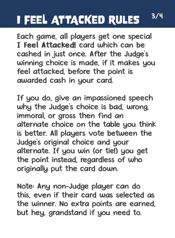 Though the first "base set" (which I hope to update in the future) is 350 cards and attempts to be un-themed, I am going to release expansions of varying sizes and themes to add to your I Feel Attacked box. Sets like Millennials Feel Attacked, Cinephiles Feel Attacked and Gamers Feel Attacked will allow you to build your box in the way that you, your friends, and your family find the most resonant and hilarious.